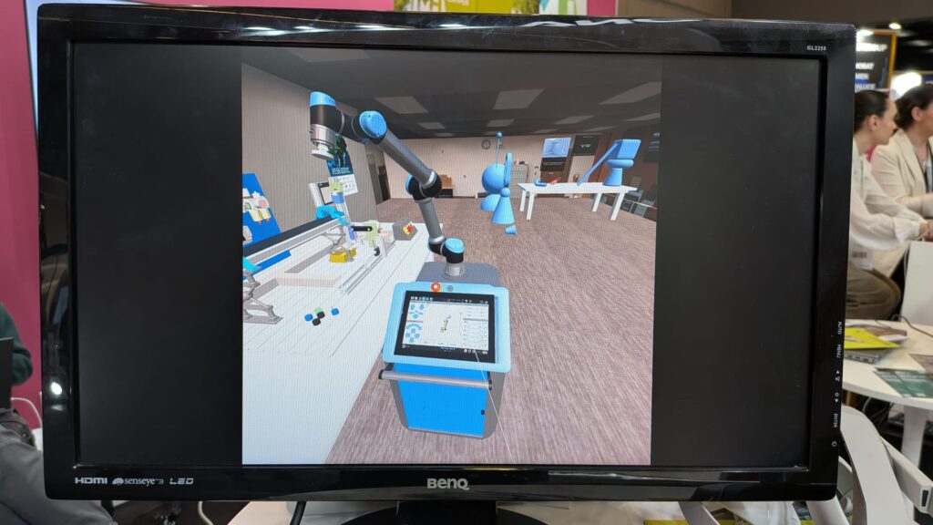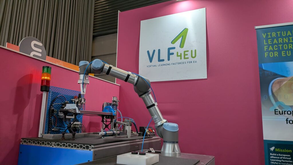 At the VLF4EU stand, visitors were able to explore an immersive digital twin (DT) of a UR industrial robot, connected to a simulated industrial cell representing a real manufacturing process. The demonstration illustrated how digital twins, immersive environments, and virtual training systems can support practical learning experiences for students and professionals in advanced manufacturing.